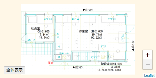 Leafletでは、画像の重ね合わせをすることが可能となっていますので、平面図を背景に設定して地図のように平行移動や拡大縮小することもできます。