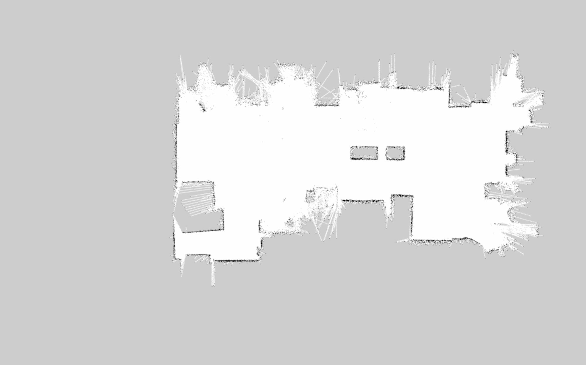 サンプルプログラムでは、平面図の画像の上に、SLAMで作成した地図を重ね合わせて表示しています。 SLAMで作成した地図とは、レーザーセンサーで距離を測定して作成した地図で、自己位置推定を推定するためなどに使われます。 透過度を0.4に設定して、重ね合わせて表示しています。