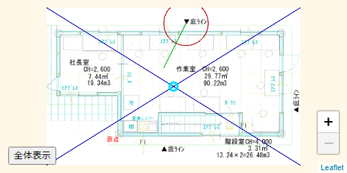サンプルプログラムでは、LeafletのCRS座標系を使ったCADの平面図の上に、キャンバスを重ねて表示しています。