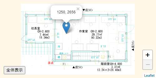 LeafletのCRS座標系を使って、CADの平面図の座標系で、クリックした位置にマーカを表示するサンプルプログラムです。