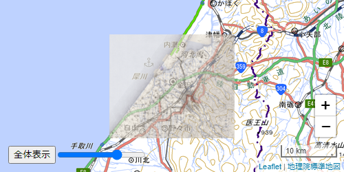 ちなみに、この画像オーバーレイレイヤ(ImageOverlay)は、タイルレイヤ(TileLayer)と同等に扱うことがきます。 ですから、複数の地図の切替と透過表示の、オーバーレイマップの定義に追加すれば、Leafletの地図切替コントロールで画像の透過度変更が可能となります。